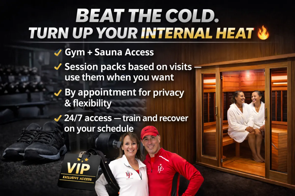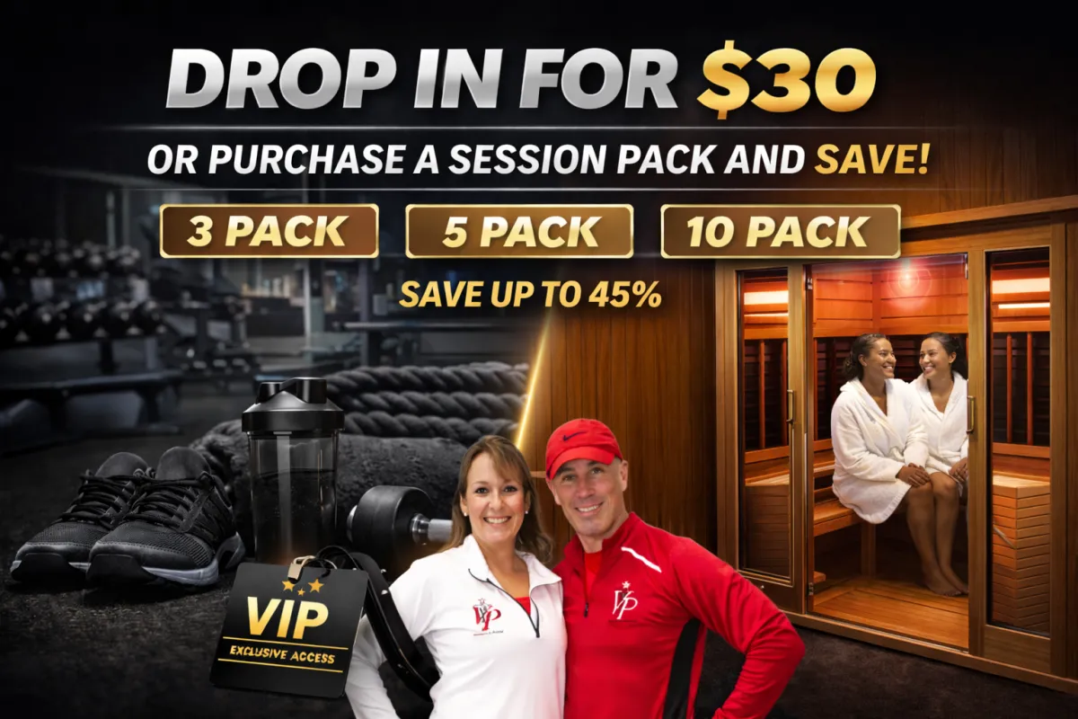 Reset your body and mind with a private infrared sauna session at VIP Fit Club. Whether you’re recovering from a workout, managing stress, or simply carving out time for yourself, our Clearlight infrared sauna delivers deep, penetrating heat to help you relax, detox, and recharge. No membership required — just book, show up, and feel the difference.